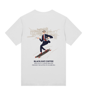 Auf der Rückseite des T-Shirts ist eine Illustration unserer Fortuna Espresso Variation zu sehen, die von Andrew Mashanov für Black Hat Coffee gezeichnet wurde. Auf der Vorderseite befindet sich eine limitierte Version des Black Hat Coffee Logos, bei der der klassische Logo-Kopf durch eine gezeichnete Variante ausgetauscht wurde.