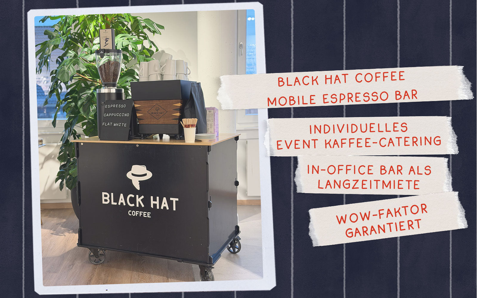 Mit unserer mobilen Espressobar bringen wir unvergesslichen Kaffeegenuss direkt an Ihren Wunschort – ob für Firmenevents, Messen, private Anlässe oder In-Office-Lösungen. Unsere stylische, minimalistische mobile Kaffee-Bar fügt sich perfekt in jedes Ambiente ein, ist mit dem besten Equipment der Branche ausgestattet und liefert Ihnen Specialty Coffee auf höchstem Niveau – von Cappuccino über Flat White bis hin zu weiteren Kaffeespezialitäten. Alles, was wir brauchen, ist nur ein Stromanschluss – und Ihre Lust auf richtig guten Kaffee.